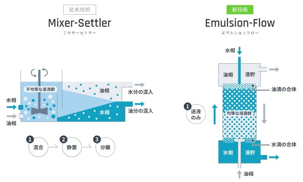 ——EFTの「エマルションフロー」は、レアメタルリサイクルに使用される溶媒抽出の性能を飛躍的に高める技術だと伺いました。従来の溶媒抽出には、どのような課題があったのでしょうか?