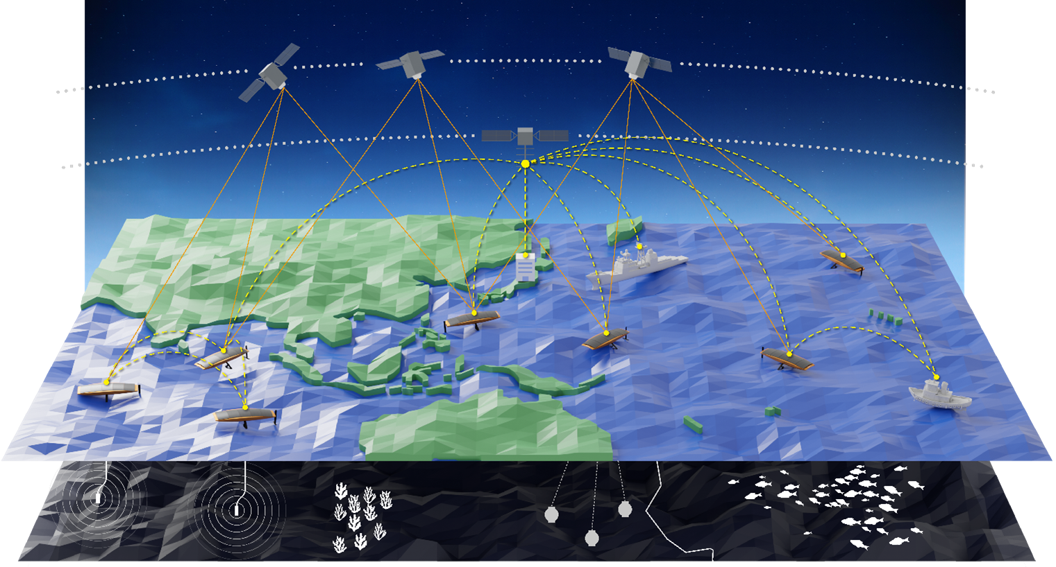 板井:私たちが目指しているのは『海の人工衛星』だとお話しましたが、海上にある人工衛星と宇宙空間にある人工衛星では、それぞれに得手、不得手があると考えています。例えば、海中を観測しようとしても、空中の衛星からでは取得できない情報は多いです。海の表面は見られても海中は難しいので、海中データが必要となると、海中に潜っていくロボットや潜水型の調査船を使います。また、水は電波を通さないので、宇宙の人工衛星と海中のモビリティやロボットをつなぐこともできない。それぞれの衛星・モビリティやロボットの技術が発達していくにせよ、海域表面には必ず、中継役が必要になるわけです。なので、ASVから始めようと考えています。